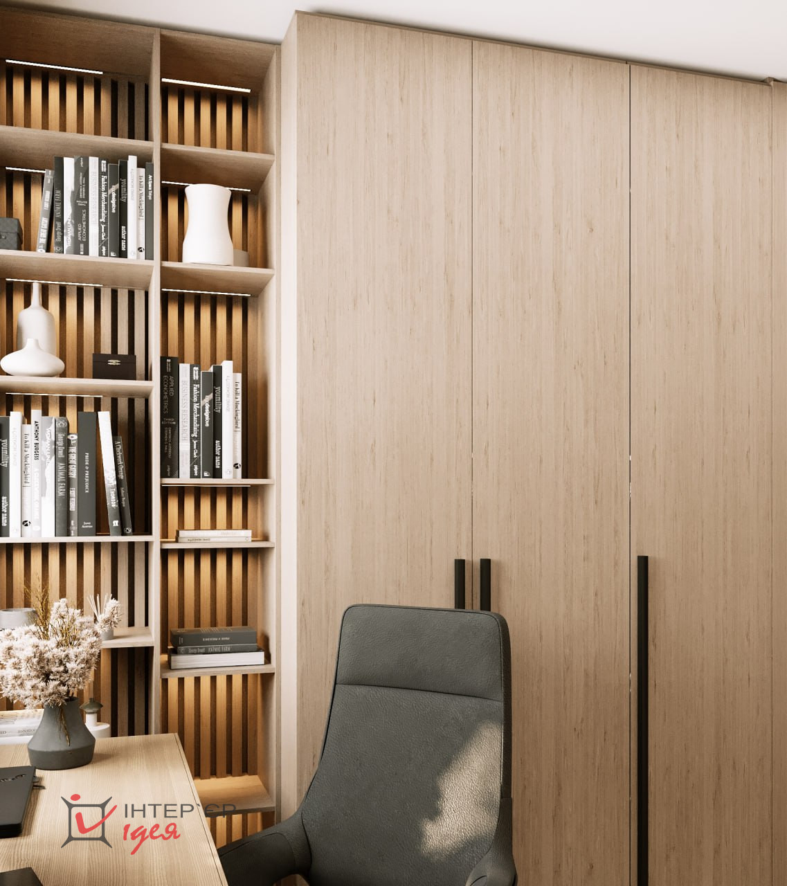 Материалы выбирались с учетом пожеланий заказчика и выбранного современного стиля рабочего кабинета, учитывались параметры комнаты.