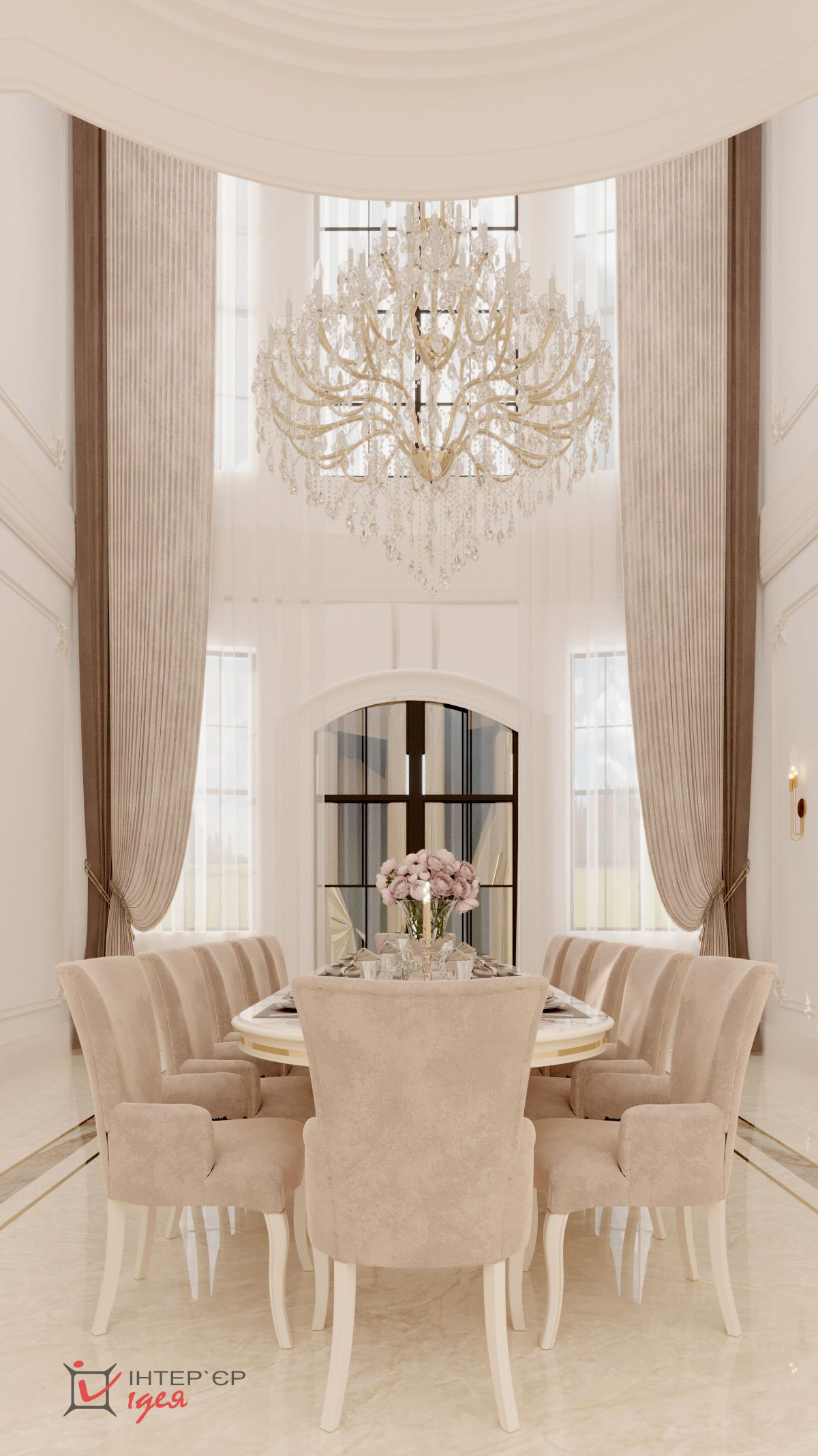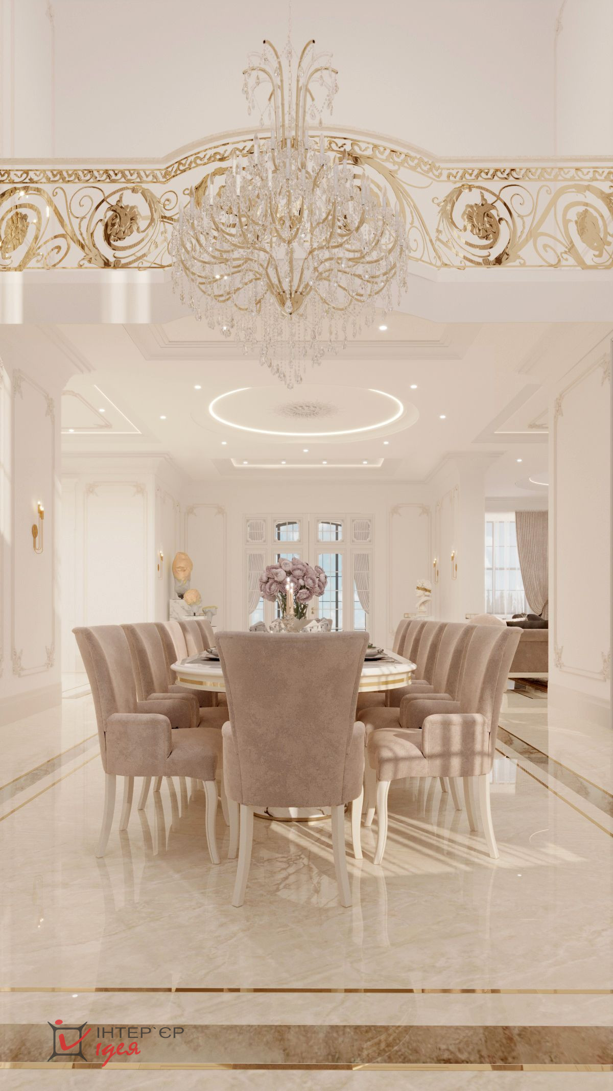 В зоне столовой создан второй свет и высота потолка достигает более 6,5 метров. Подчеркивая высокие деревни, мы объединили различные виды освещения: большие, роскошные люстры из хрусталя и позолоты, настенные бра из люксовой коллекции и декоративные LED подсветки. Таким образом, мы подчеркнули масштабность помещений.