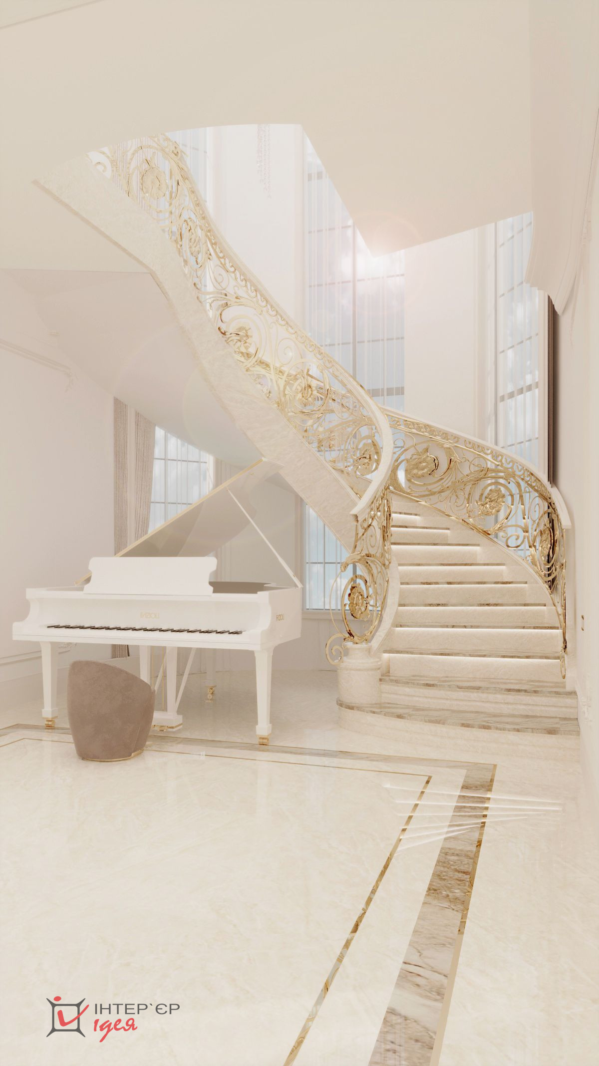 Это роскошное пространство разделено на несколько зон: отдыха, столовую, прихожую, лестницу.