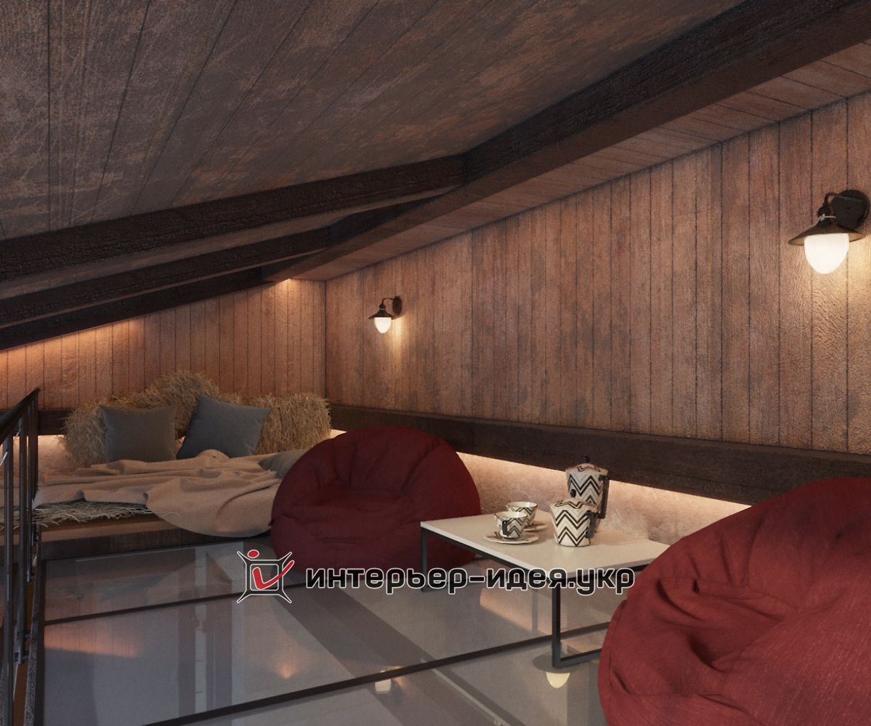 Отдельным элементом стал второй этаж с деревянной лежанкой и импровизируемым "сеновалом", куда можно забраться по стеклянной лестнице. Также на втором этаже разместились два красных кресла-мешка и кофейный столик.