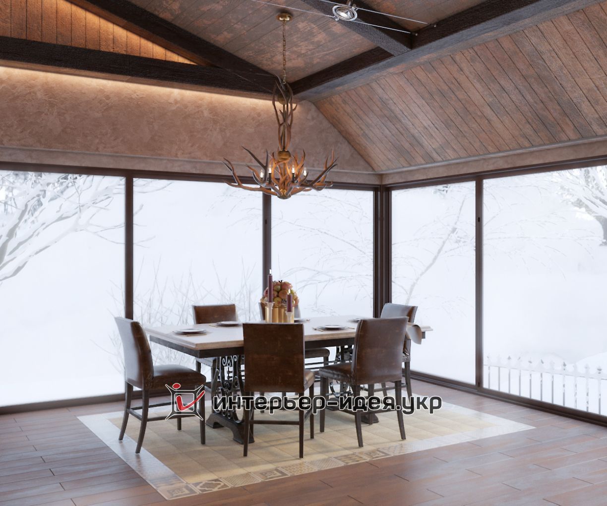 Удивительный охотничий домик - идеальное место для отдыха. Перед дизайнером стояла задача создать уютное, многофункциональное помещение. Главным элементом отделки конечно же выступает дерево, им полностью зашит потолок с темными состаренными балками. В поддержку брутальному интерьеру нужна была массивная мебель и аксессуары. Мягкая мебель производителя Blanche подошла идеально. Дополнили атмосферу элементы освещения: медные подвесы, бра в виде фонариков и невероятная люстра с имитацией рогов.