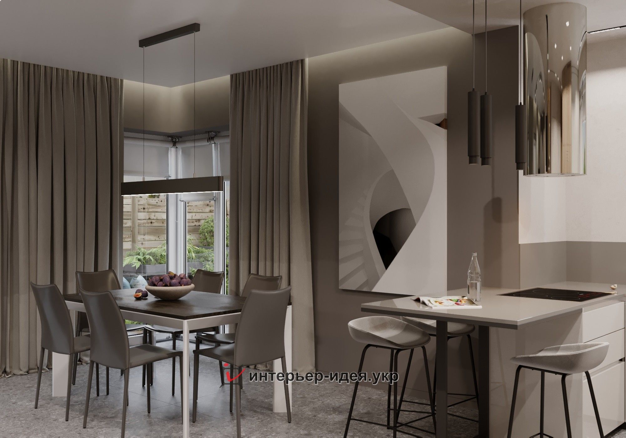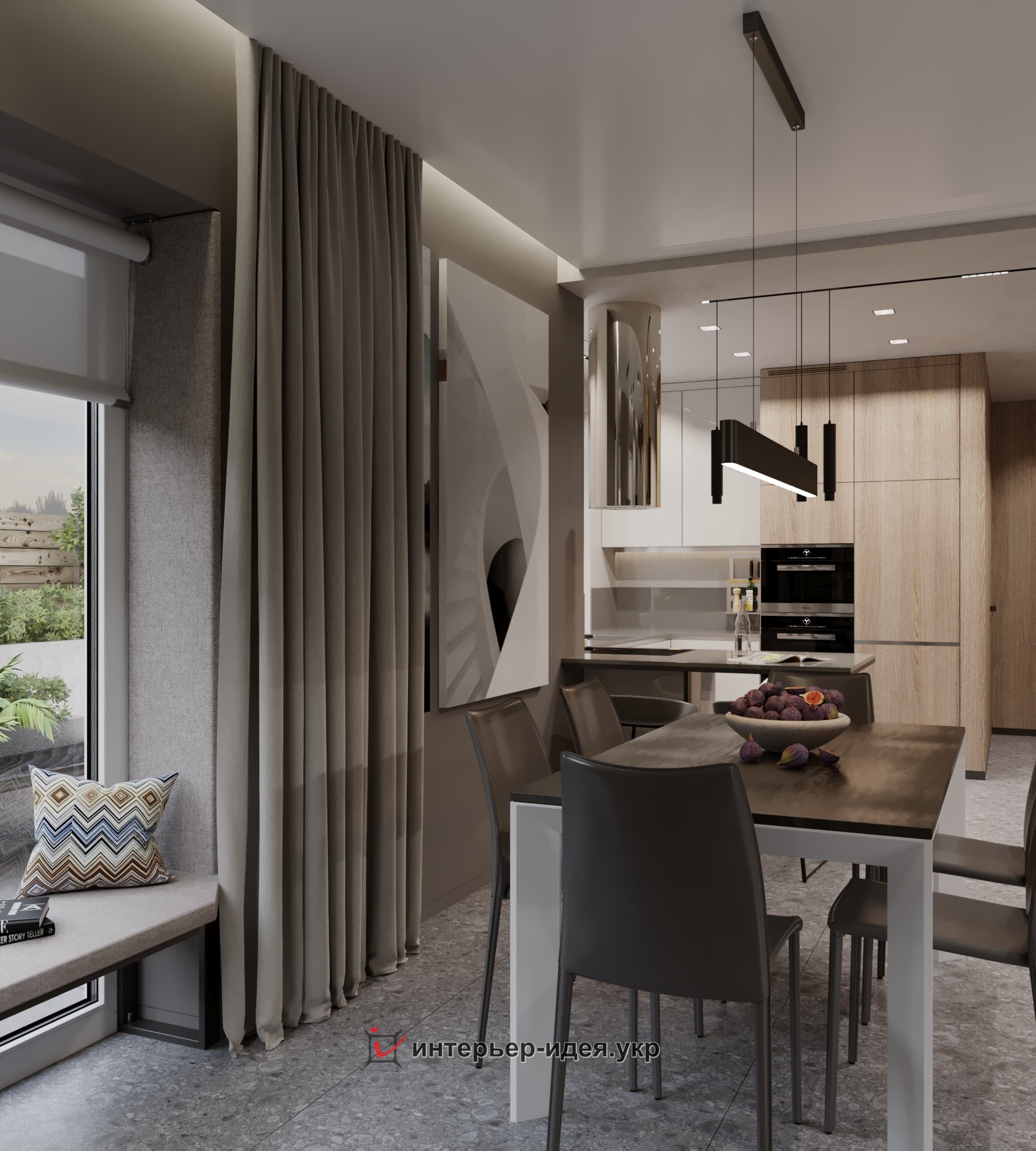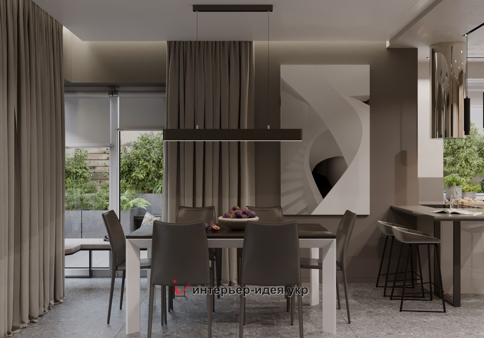 Так как в гостиной много окон и они выходят на солнечную сторону, цветовое решение данной зоны более темное и приглушенное.