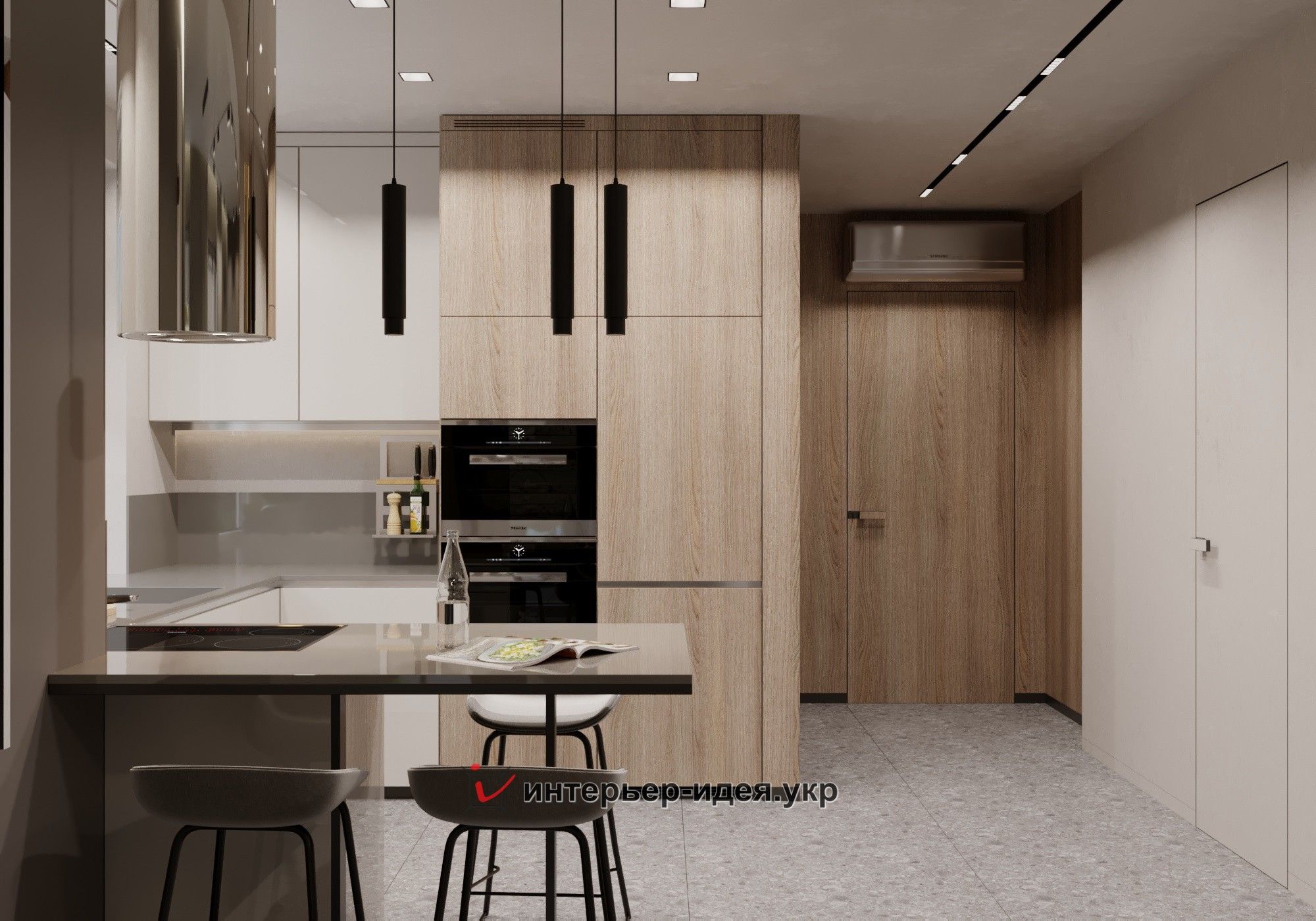 Деревянные панели на стене во входной зоне плавно переходят на кухонную мебель.