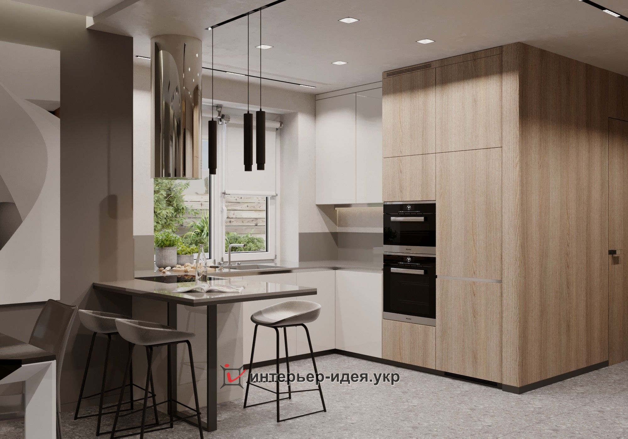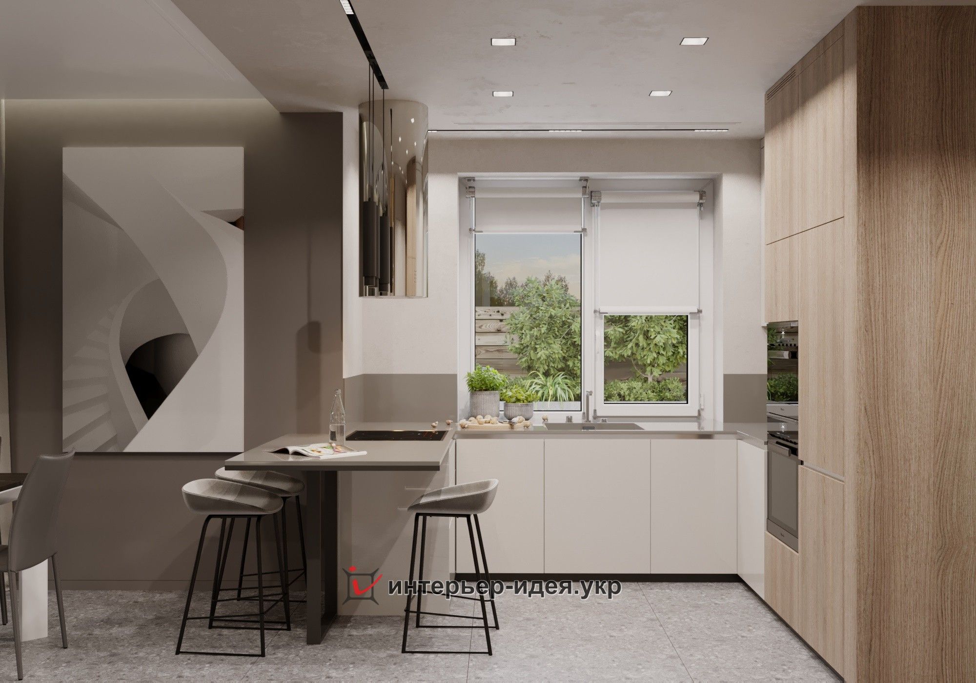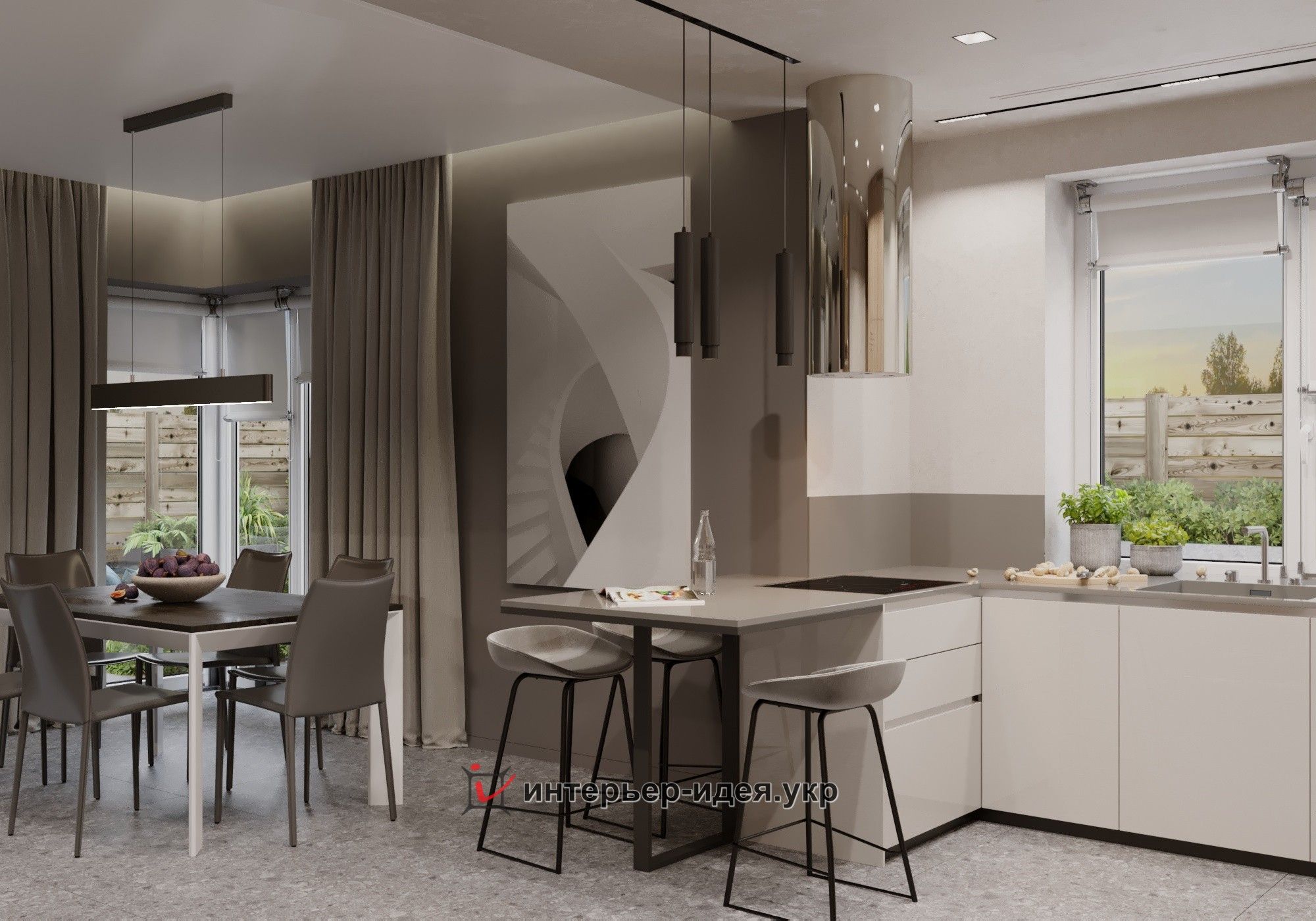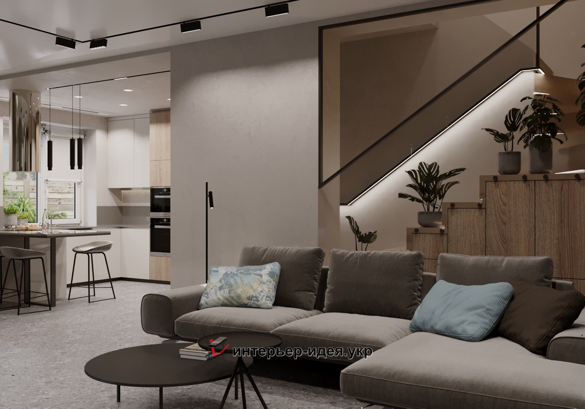 Она светла и воздушна, интересно объединяется с гостиной стеклянной перегородкой и как бы зазывает в зону 2-го этажа. Место под лестницей также функционально.