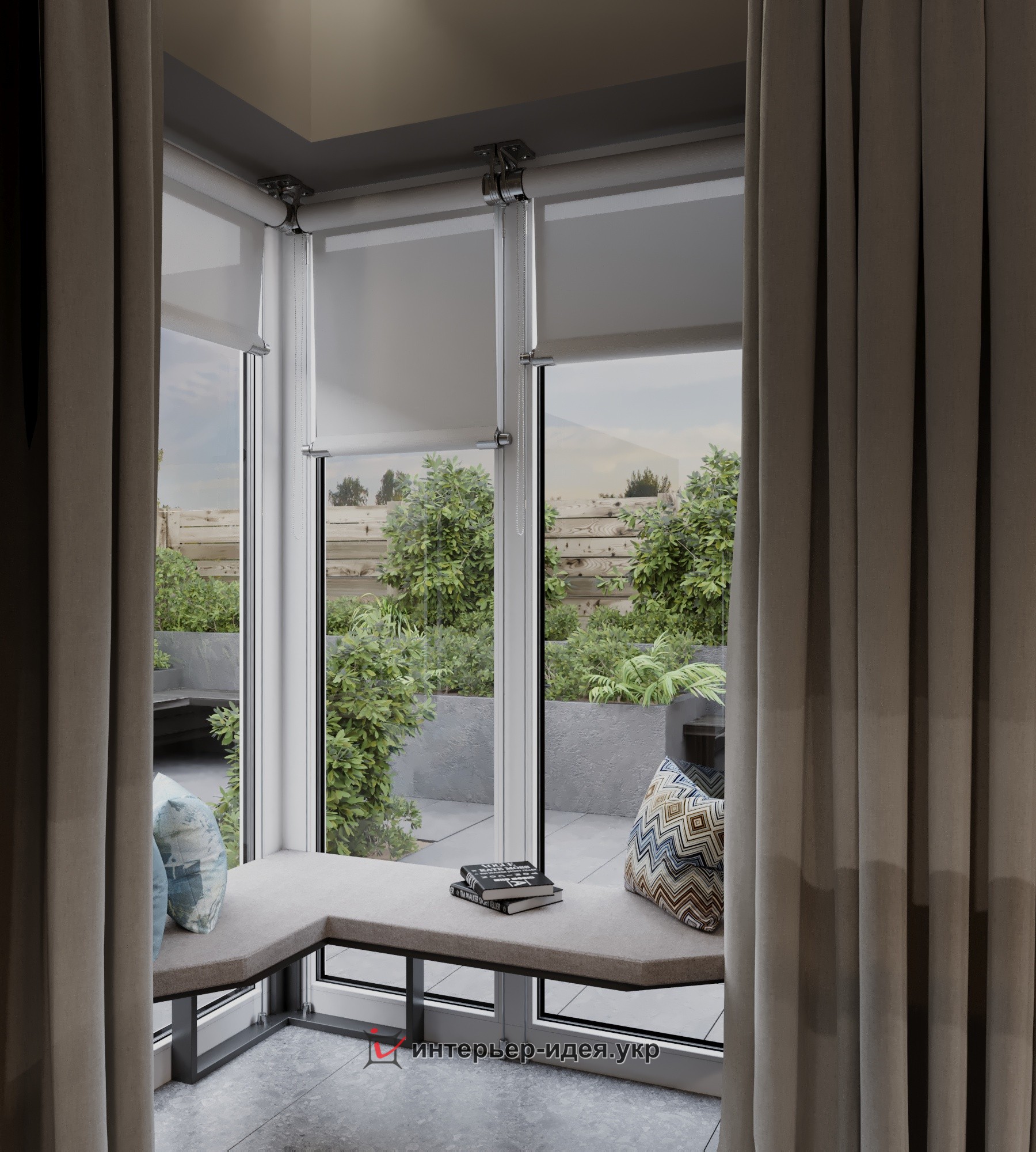 Интересным решением было разместить небольшую скамеечку вдоль углового окна гостиной.