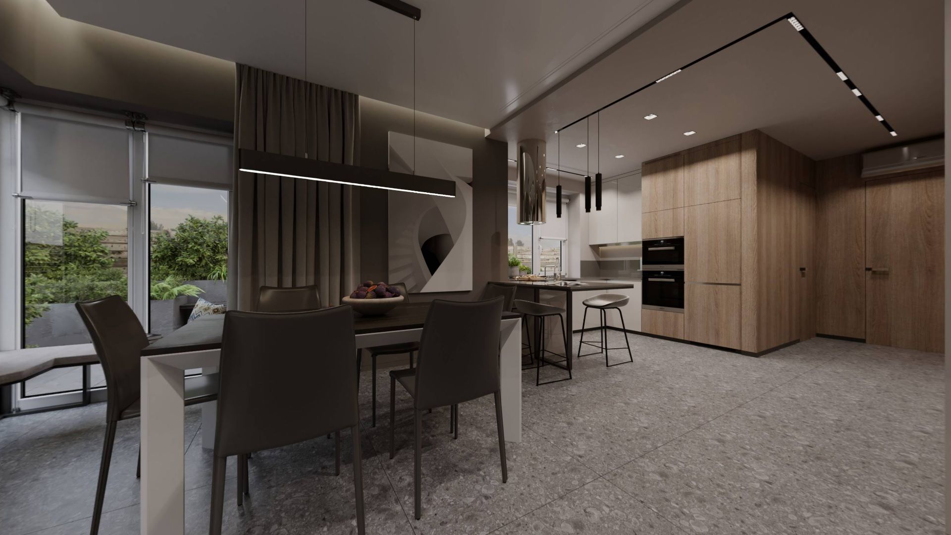 Один из приемов который мы использовали в данном помещении, - перетекание форм и материалов, таким образом мы объединили и связали весь интерьер.