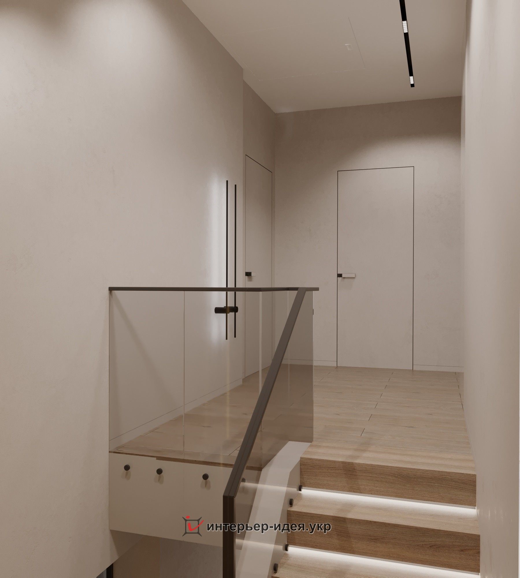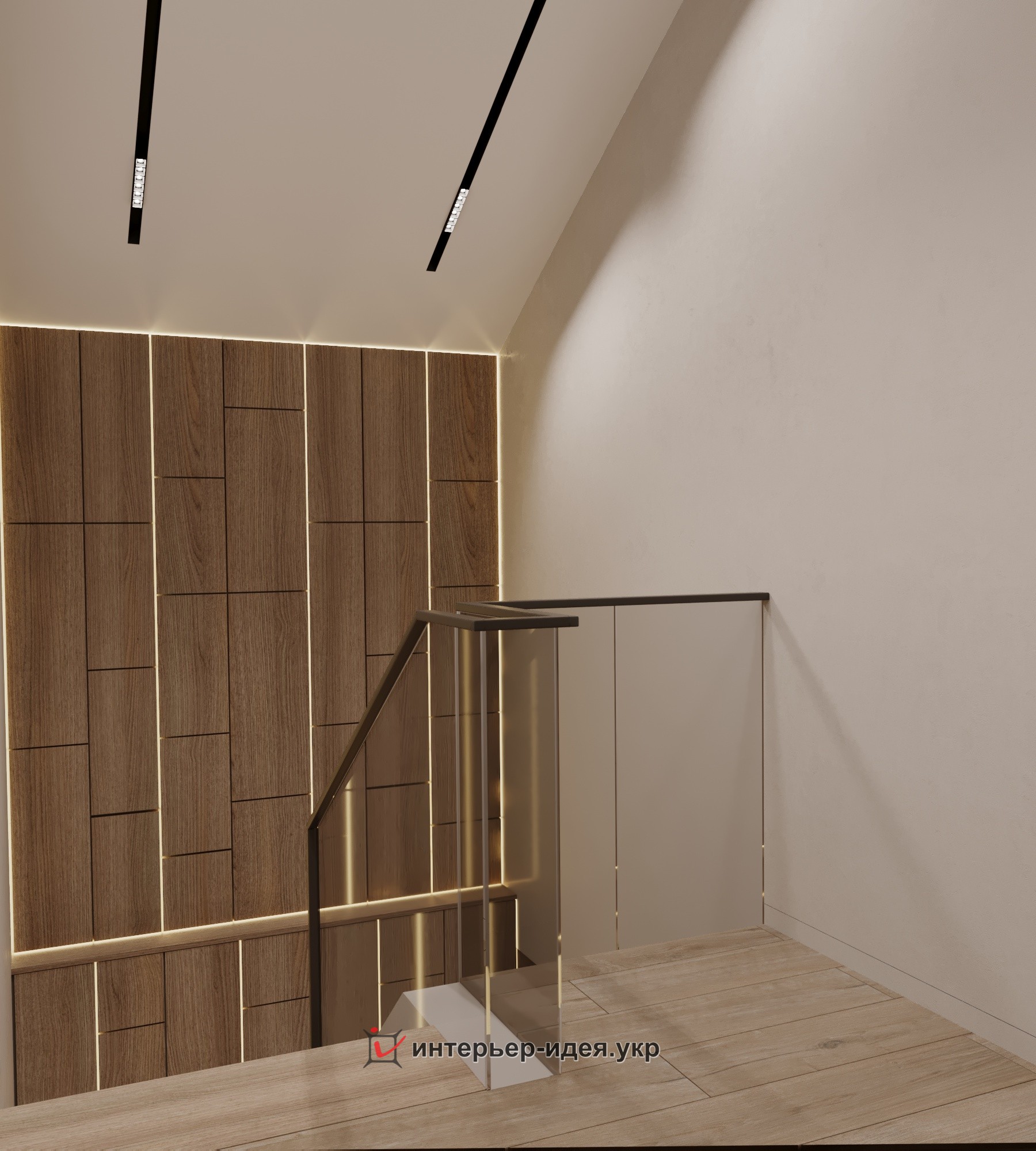 Особого внимания в данном интерьере требует решение оформления лестничной площадки.