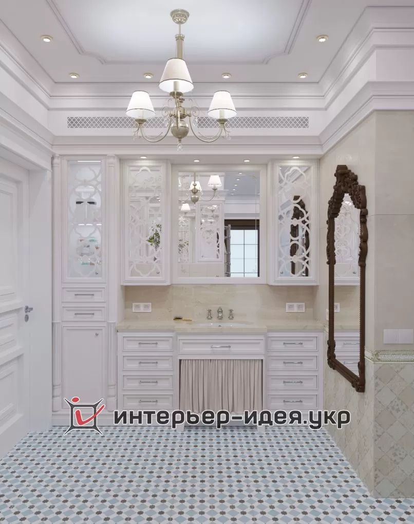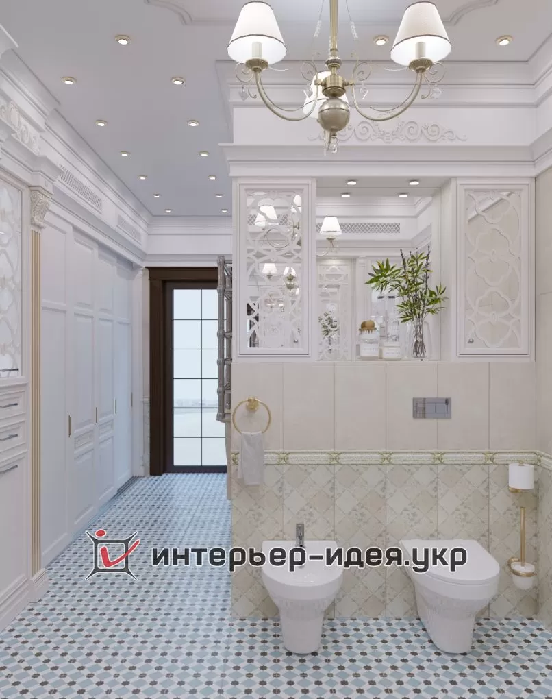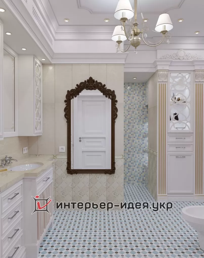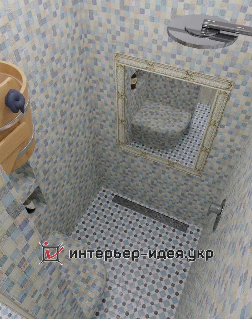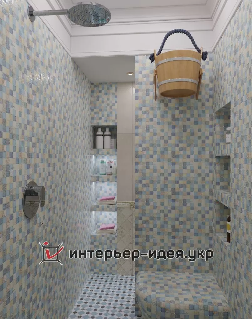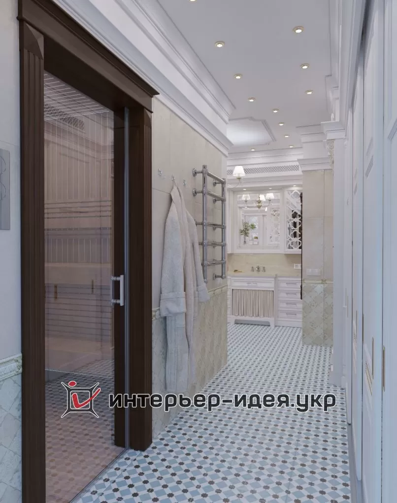 Просторный санузел с сауной и выходом на улицу воплощен в классическом стиле и главной задачей экспериментировать с разными видами плитки и мозаики.