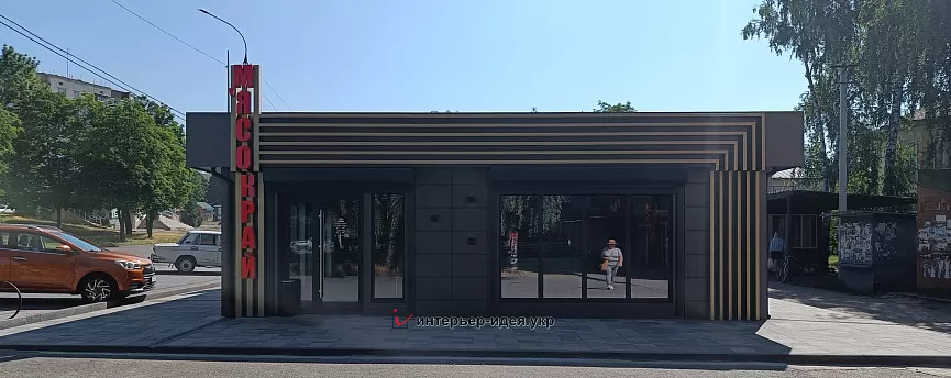 В качестве основного отделочного материала был выбран вентилируемый фасад, выполняющий не только эстетическую но и практическую роль. Он защищает от негативных климатических явлений и создает современный стильный вид магазина.